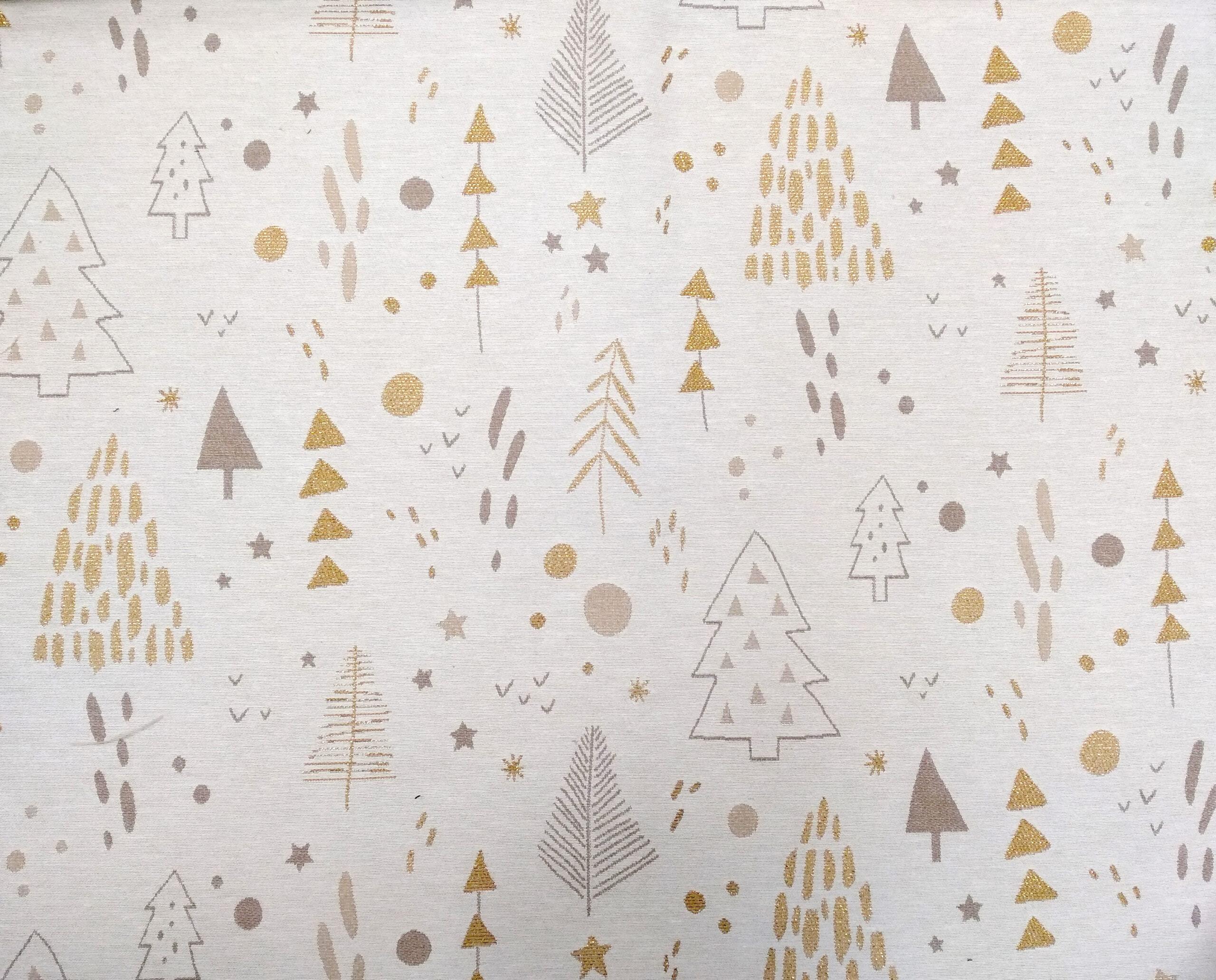 Fin juleakryldug med grafiske juletræer på sandfarvet bund. Dugen har en struktureret overflade og antislip på bagsiden. De grafiske elementer er vævet med guld tråde, hvilket giver dugen et super fint udtryk. Tekstildugen kan vaskes ved 40 grader. Kan i
