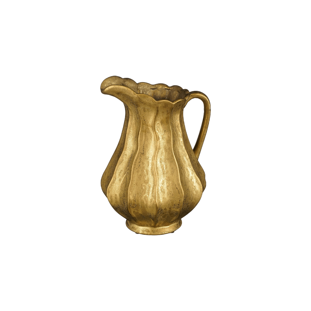 Meget dekorativ, guldfarvet kande i keramik med brede riller, der danner et rustikt mønster. Kanden kan både bruges til kolde og varme drikke eller fyldes med en buket blomster. Mål:Længde: 24 cmBredde: 21 cmHøjde: 30 cmFremstillet af keramik.Pakket med 1