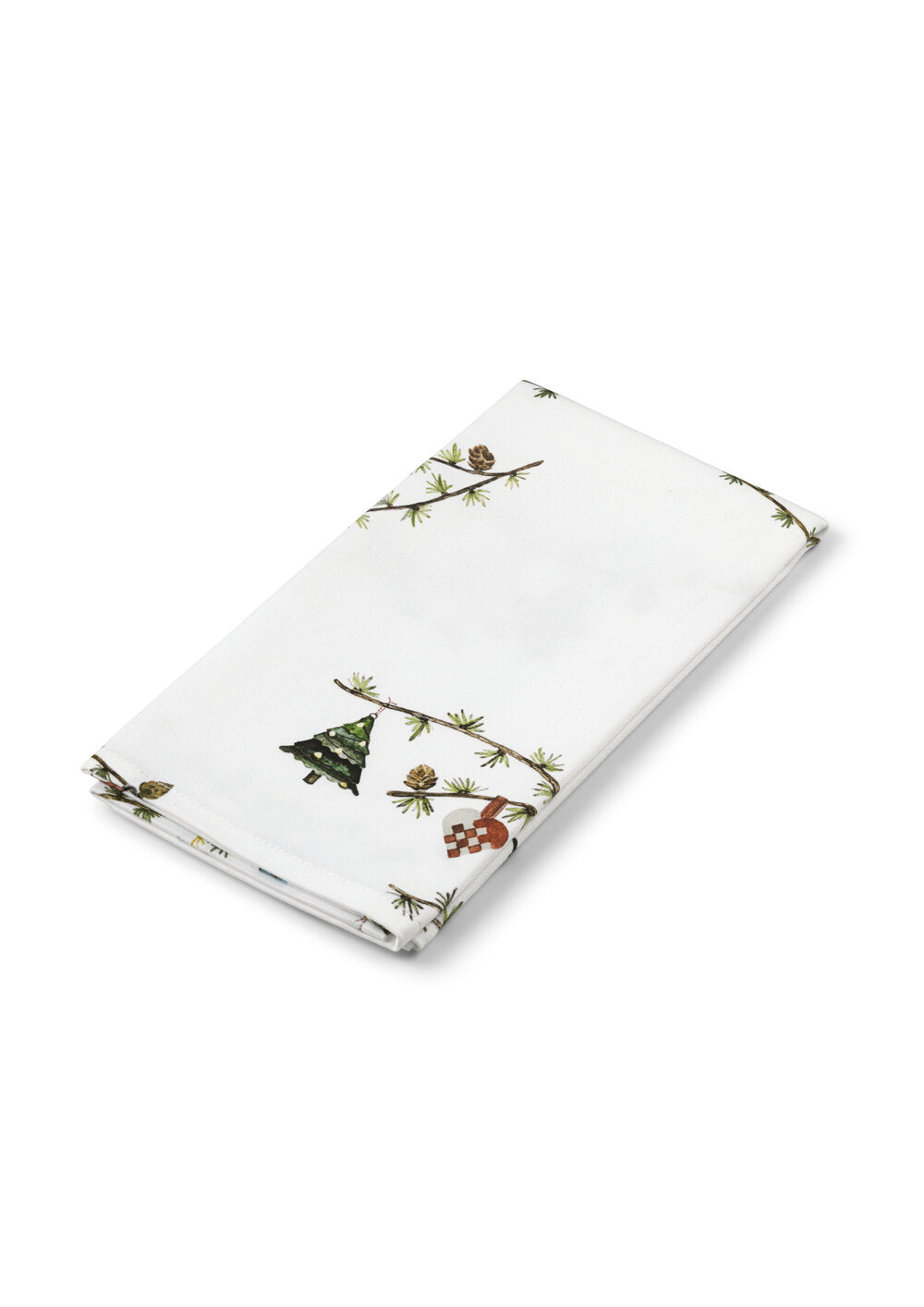 Hammershøi Christmas Stofservietten er designet i hvid bomuld og dekoreret med fine motiver af lærkegrene hvorpå der hænger forskellige juleornamenter. Stofservietterne kommer i en pakke med 4 stk. og