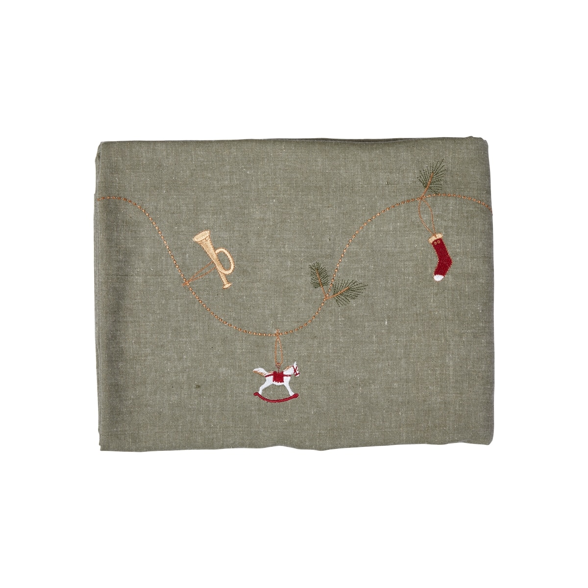 Grågrøn dug med broderede julemotiver ned gennem midten. Juledugen er en hyggelig tradition på julebordet. Dugen er fra Speedtsbergs serie med juleduge og juleservietter.Mål:Længde: 240 cmBredde: 140 cmFremstillet i bomuld 65 % og hør 35 %.Vaskes ved 30 g