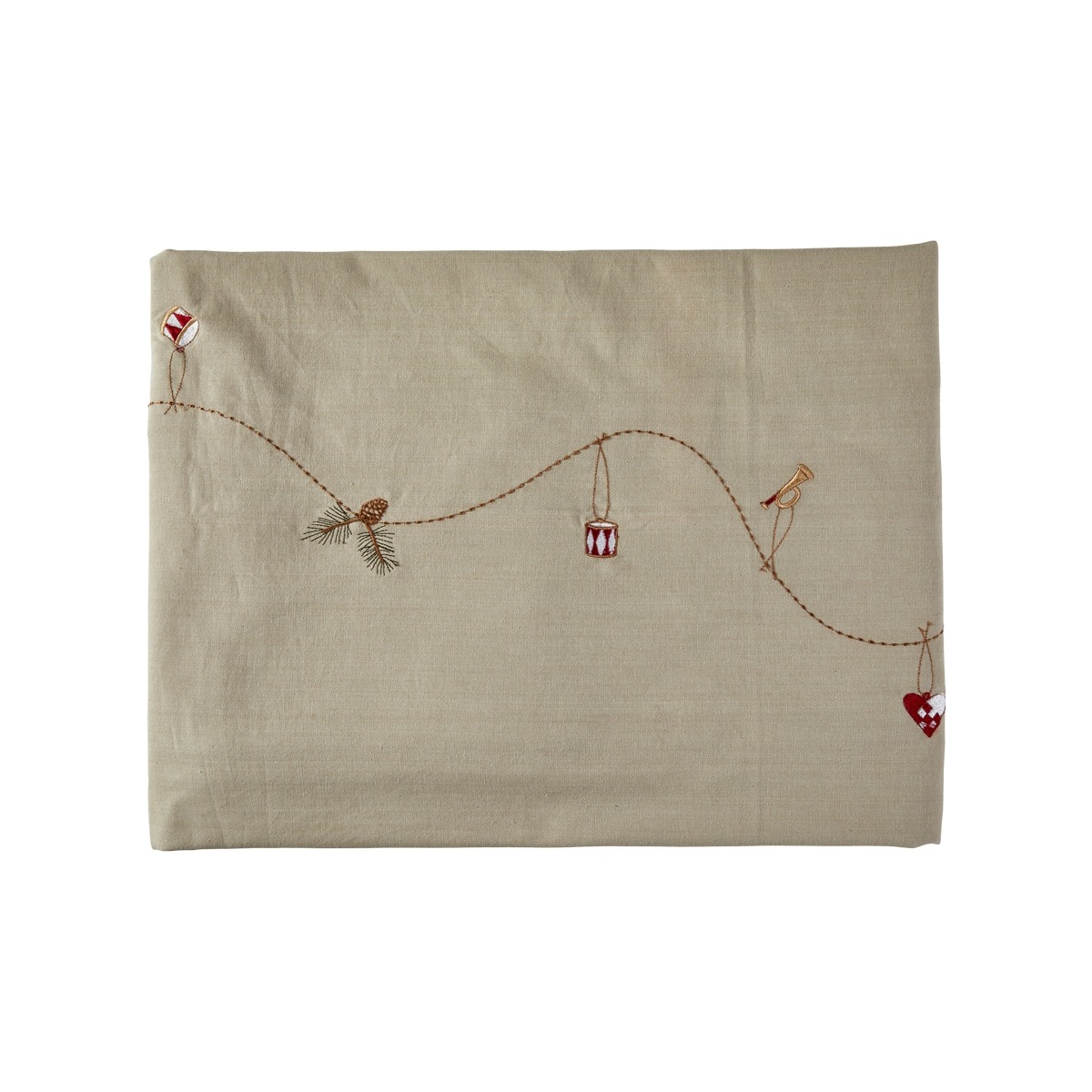Hørfarvet dug med broderet guirlande ned igennem midten af dugen pyntet med klassiske julemotiver som trumpet, flethjerte, tromme og kogle. Enkel og meget stilfuld til julens festlige borddækning. Juledugen er en hyggelig tradition på julebordet og kan ko