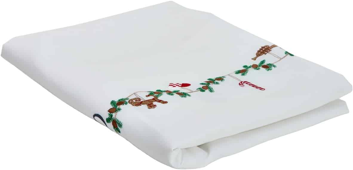 Denne originale jule dug med broderede julemotiver som sukkerstokke, nøddeknækker, hjerter og stjerner skaber dugen den perfekte ramme for julens hyggelige stunder. De fine motiver snor sig elegant gennem midten af dugen, omgivet af grankviste og kogler.