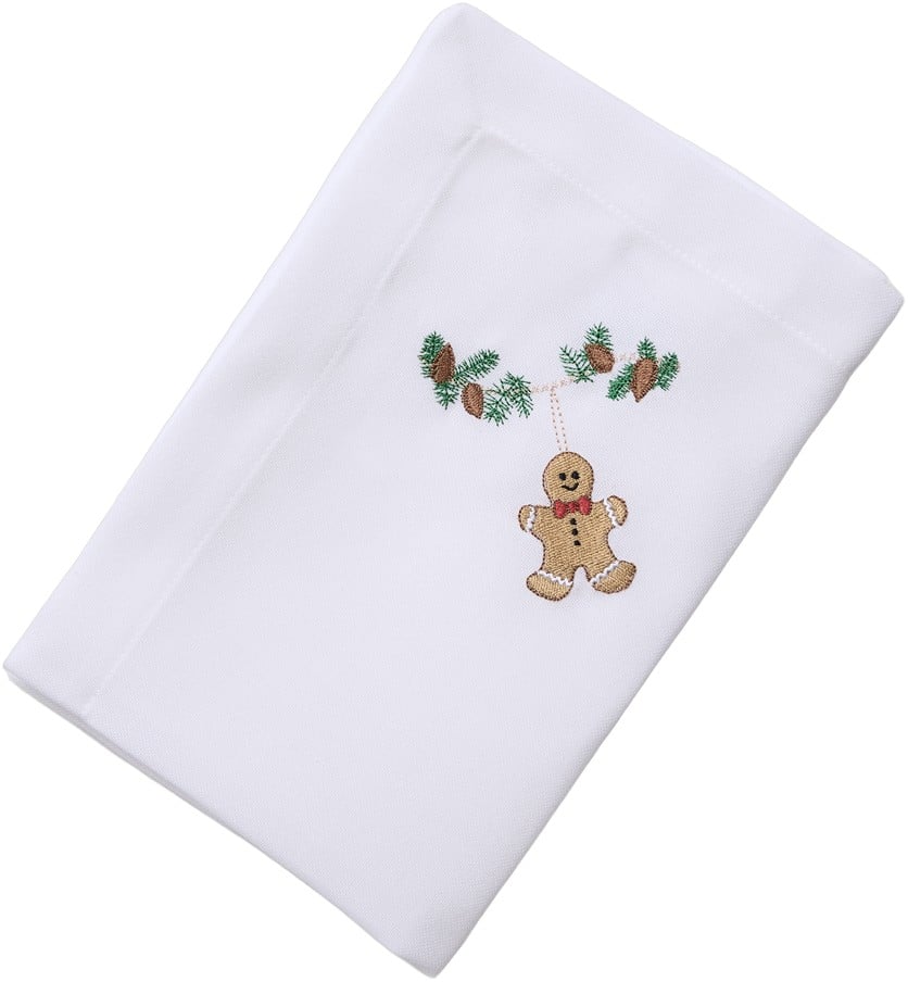 Klassisk Juleserviet med en peberkagemand. Denne smukke og klassiske juleserviet er syet i ægte hvid flagdug på Langkilde & Søn egen systue. Broderet med et elegant motiv af en peberkagemand på en grankvist med kogler bringer servietten både tradition og