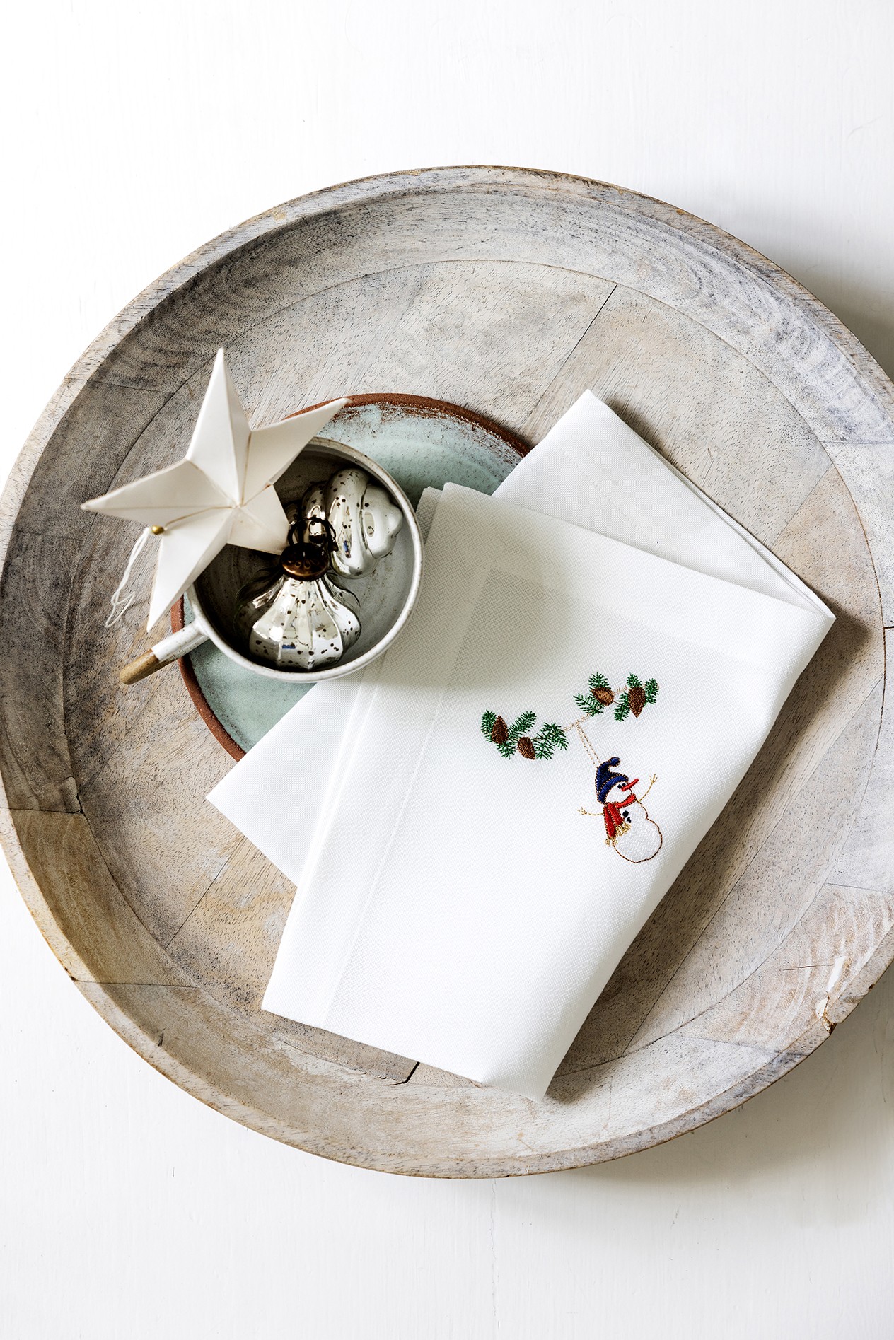 Utrolig flot og klassisk juleserviet, syet på Langkilde & Søn egen systue i ægte, hvid flagdug. Juleservietten er flot og unikt broderet med motiv af herlig snemand på grankvist med kogler. Du får en flot serviet, som vil pynte på ethvert julebord. Servie