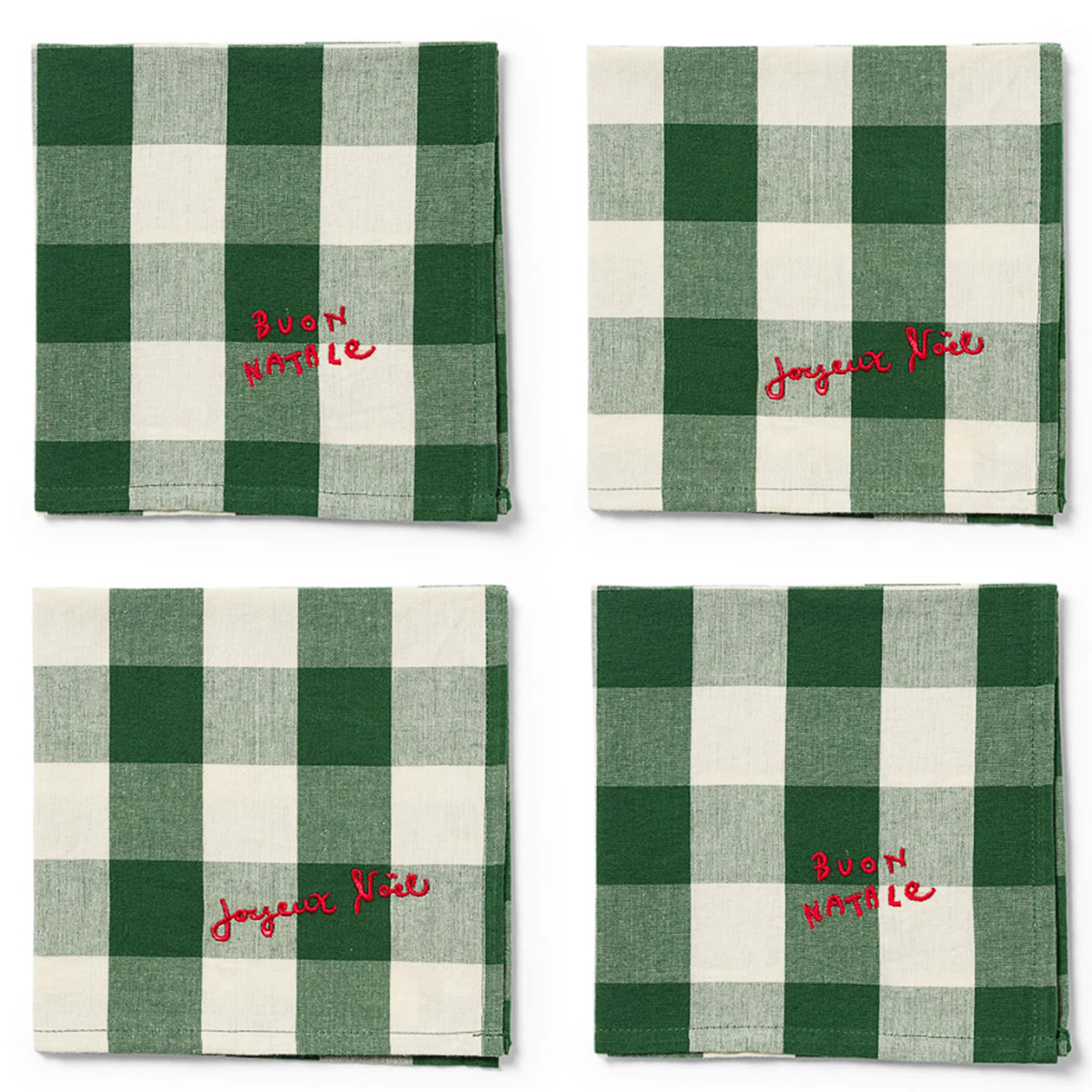 Giv julebordet et personligt og festligt udtryk med Elsa Christmas-tekstilerne fra Midnatt, som leveres i et sæt med fire servietter. Farverne tager udgangspunkt i det klassiske grønternede mønster, suppleret af rød broderet tekst, der spreder julestemnin