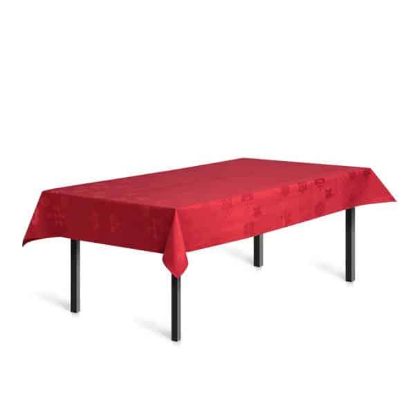 Super smuk juledug i flot jule rød farve Rosendahl Natale-damaskdugen i rød fra Rosendahl er en smuk jacquardvævet juledug, som er smuds- og væskeafvisende. Den smukke juledug er prydet med dekorative juledetaljer, og den er både perfekt på bordet selve j