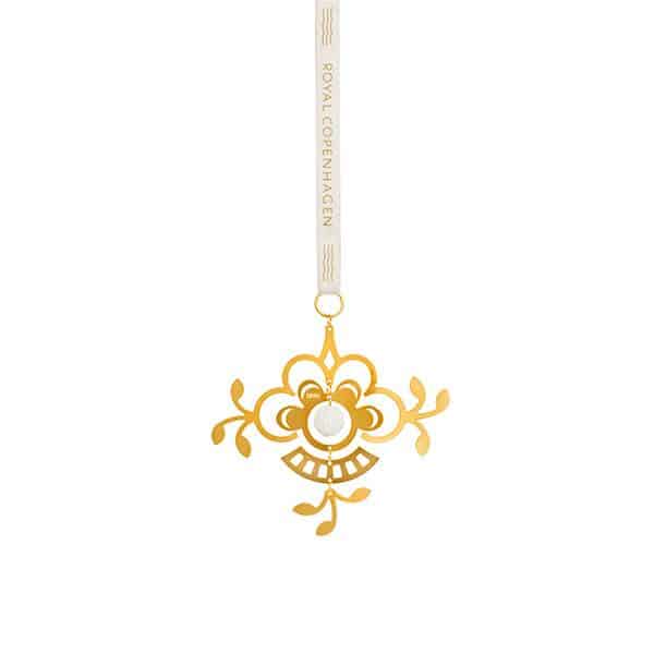Smukt Mussel ornament fra Royal Copenhagen Dette forgyldte ornament er udsmykket med et floralt motiv hentet fra det ikoniske Musselmalet Riflet-mønster. Ornamentet består af fire separate dele, der giver mulighed for en yndefuld bevægelse i lyset fra ste
