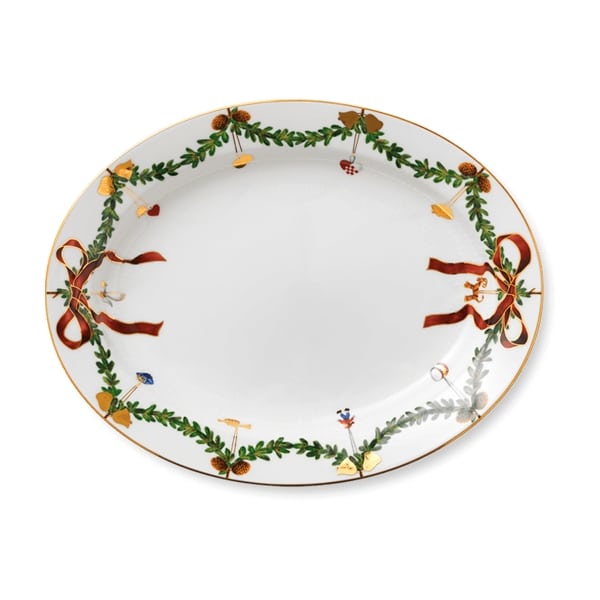 Fad på 37 cm fra Royal Copenhagens Stjerne Riflet Jul-kollektion. Bredde: 37 cm Materiale: Benporcelæn Stjerne Riflet Jul-stellet fra Royal Copenhagen hører til julens smukke traditioner. Få tallerkener, skåle og kopper dekoreret med elegante silkesløjfer