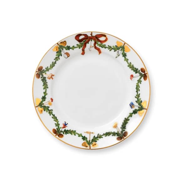 Tallerken på 19 cm fra Royal Copenhagens Stjerne Riflet Jul-kollektion. Stjerne Riflet Jul-stellet fra Royal Copenhagen hører til julens smukke traditioner. Få tallerkener, skåle og kopper dekoreret med elegante silkesløjfer og det fineste julepynt. Skab