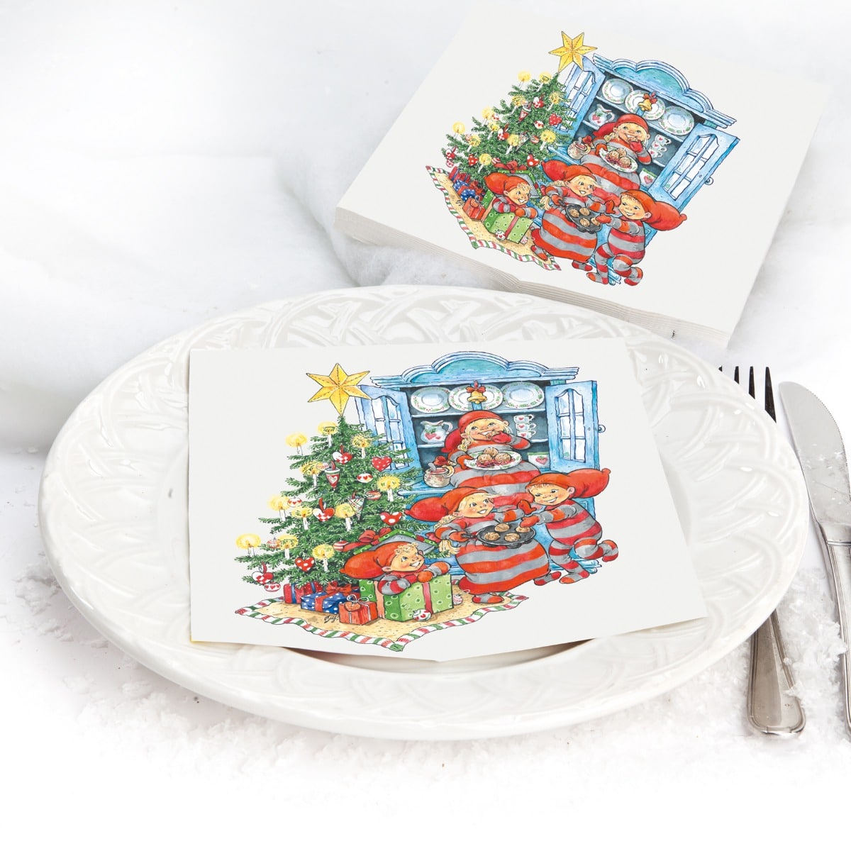 Sæt den hyggelige julestemning på bordet med de søde servietter med babynisserne, der er i fuld gang med at bage julekager. Motivet oser af julehygge og passer godt til både julefrokost, småkagebagning og adventshygge. Servietterne er fremstillet i 3-lags