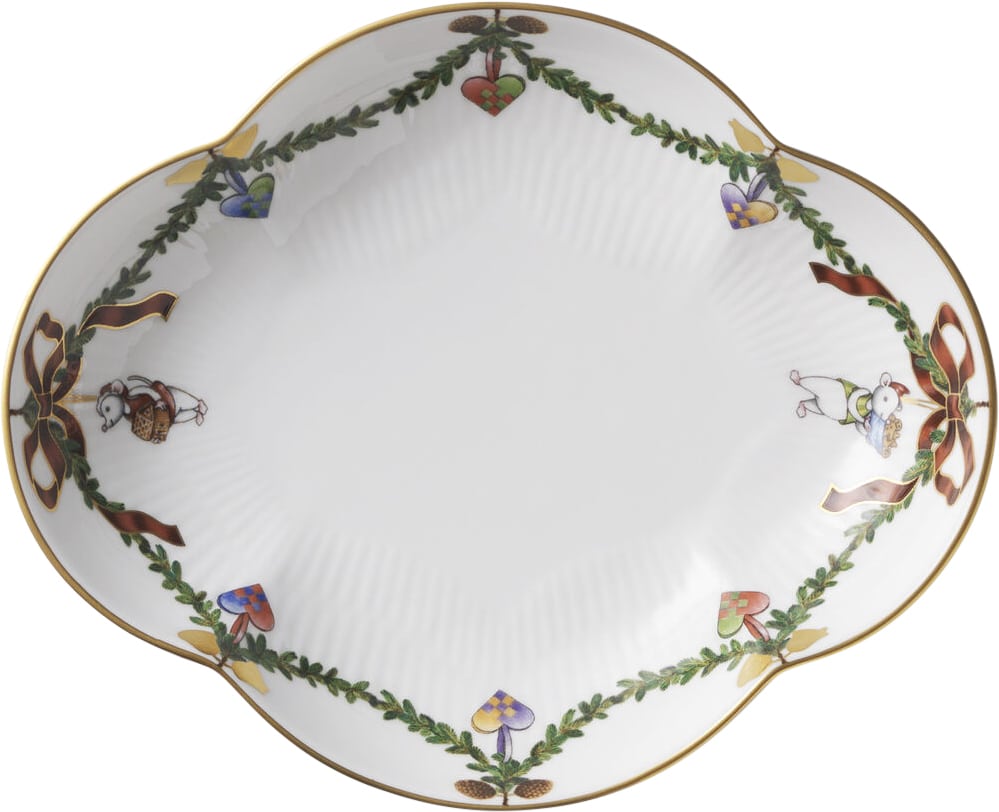 Det mindre fad i Stjerne Riflet Jul er skræddersyet til juletidens søde serveringer. Som enhver steldel i Stjerne Riflet Jul er fadet udsmykket med sit eget udvalg af julepynt med flettede julehjerter og småkager formet som mus.